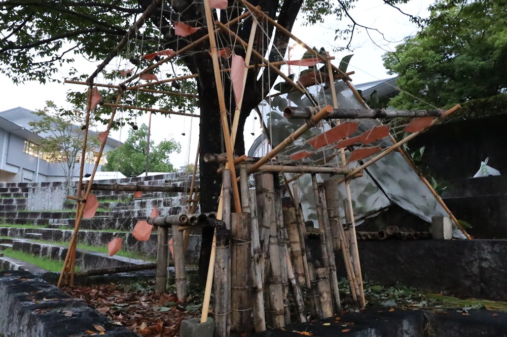 Earlier this fall, architecture students from Auburn University (USA) visited campus as part of a collaborative program with students from Kyoto Seika University’s Department of Architecture. Led by faculty members from both universities, the students broke into six groups to create “Primitive Hut” structures around campus. While the use of naturally found materials was a primary focus for the project, this year the use of human-made materials was also allowed. In addition, students were asked to envision that Gregor Samsa, the main character from Franz Kafka’s literary classic The Metamorphosis, would be the one to use their structures.