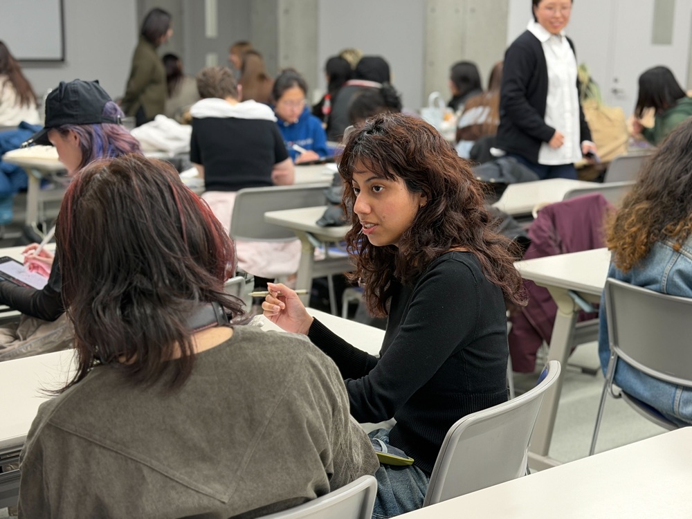 Late last month a group of students from the Fashion Institute of Technology (FIT) in New York visited the Kyoto Seika University campus to learn about our programs and participate in Duncan Brotherton’s Design English class. Students were first treated to a brief introduction of the class before breaking into groups where they discussed interests, shared examples of their work, and even made a series of sketches of their conversation partners.