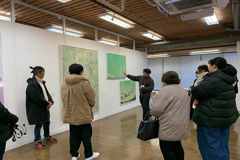 教員の案内で芸術学部の展示会場を巡りながら、学生たちの作品プレゼンテーションを鑑賞します。