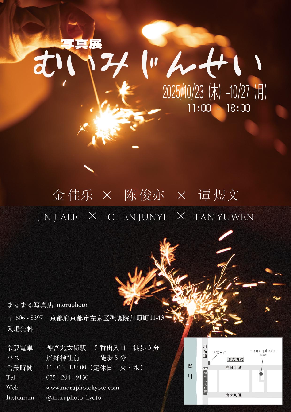 デザイン学部2年生のJIN JIALEさんとメディア表現学部3年生のCHEN JUNYIさん、TAN YUWENさんの3人による写真展「むいみじんせい」が、京都・聖護院のまるまる写真店で開催されます。ぜひお立ち寄りください。