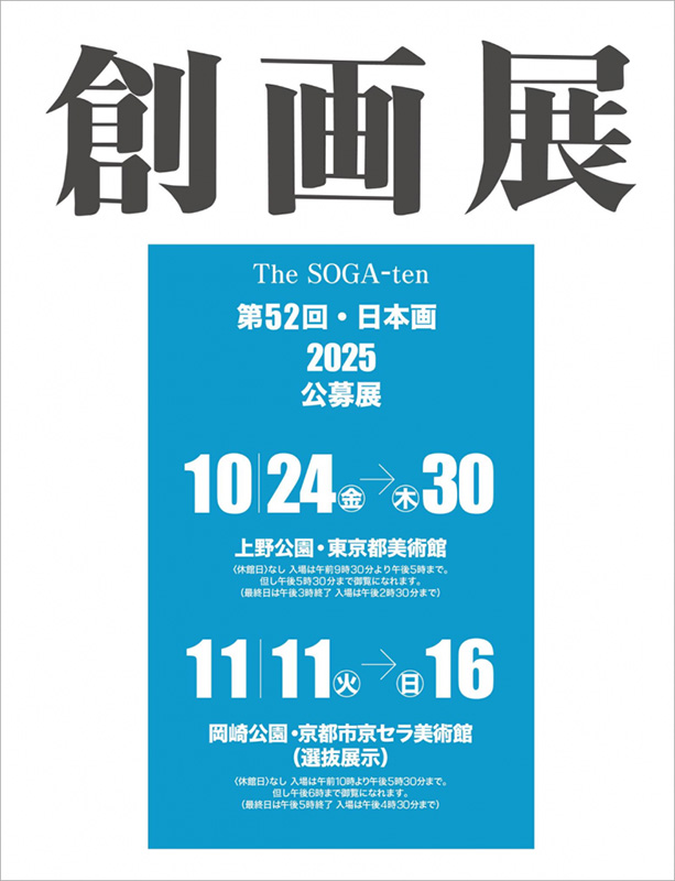 ● 東京会期:2025年10月24日(金)〜10月30日(木)時間:9:30〜17:30(最終入館17:00まで)最終日は9:30~15:00(最終入館14:30まで)会場:東京都美術館料金:一般 1,000円/大学生まで無料● 京都(選抜展示※)会期:2025年11月11日(火)〜11月16日(日)時間:10:00〜18:00(最終入館17:30まで)最終日は10:00〜16:00(最終入館14:30まで)会場:京都市京セラ美術館料金:一般 800円/大学生まで無料※選抜作品のみの展示となります。詳細は公式サイト(受賞者 入選者 入選作品一覧)よりご確認ください。 -