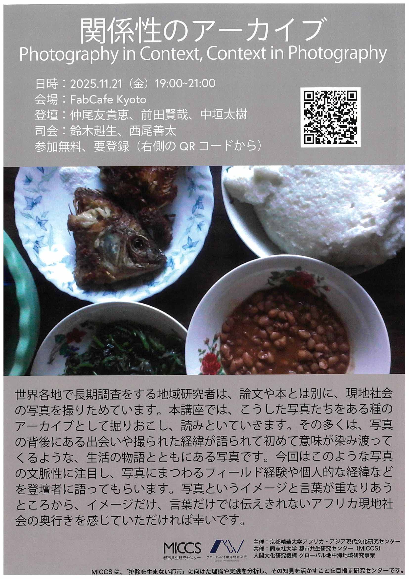京都精華大学アフリカ・アジア現代文化研究センターが主催する公開講座「関係性のアーカイブ —Photography in Context, Context in Photography—」を、京都・FabCafe Kyotoにて開催します。