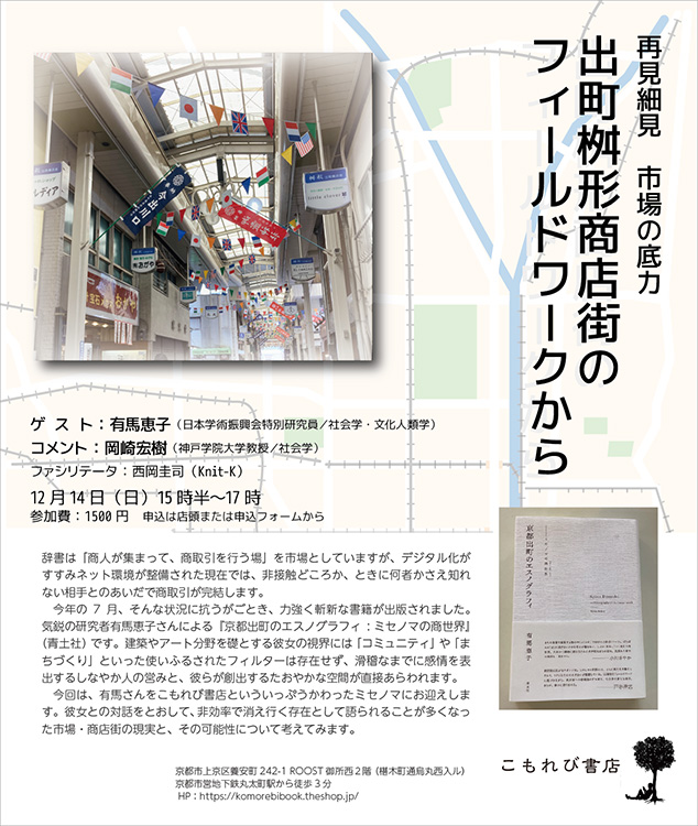 店が営まれる空間や、そこで展開される人々のやりとりに興味のある方におすすめのイベントです。書籍『京都出町のエスノグラフィ -ミセノマの商世界-』をまだ読んだことのない方も、ぜひお気軽にご参加ください。