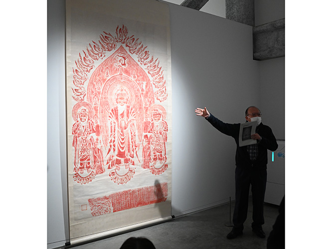 トークでは、資料収集委員として所蔵品の収集活動に関わった経験のある教員や所蔵作家をよく知る教員方にご出演いただき、洋画作品を生駒泰充(洋画専攻 教員)、拓本を山名伸生(人文学部 教員)、版画作品を北野裕之(版画専攻 教員)と池垣タダヒコ(版画専攻 教員)、小林陸一郎作品を吉野央子(立体造形専攻 教員)、西田潤作品を宮永甲太郎(陶芸専攻 教員)よりご紹介いただきました。