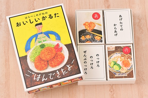 「はらぺこめがね」にとって初めてのかるた作品で、絵札の絵はもちろん、箱や読み札に登場するイラストもすべて今回のために描き下ろされました。細部まで描き込まれた「はらぺこめがね」による食べ物のイラストを、ぜひ手に取ってご覧ください。
