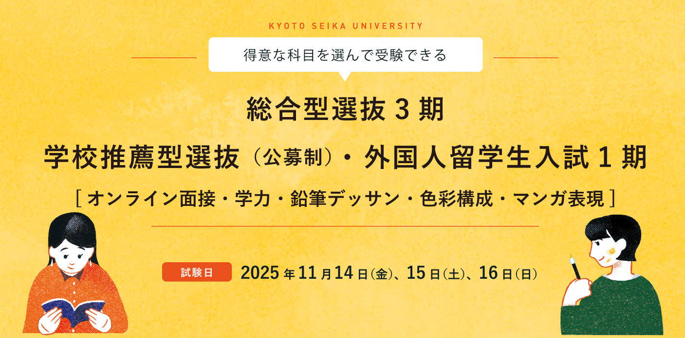 総合型選抜3期・学校推薦型選抜(公募制)・外国人留学生入試1期の出願をされた方へ、当日までにご用意いただくことや、大学へのアクセス方法などをご案内します。