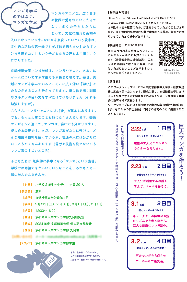 このワークショップは、2024年度京都精華大学個人研究奨励費の助成を受けたものです。研究に際し、京都精華大学における人を対象とする研究倫理審査の承認を受け、京都精華大学学長の許可を得て実施します。