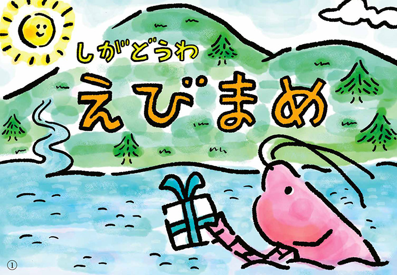 今回の紙芝居では、童話「しがどうわ」の作者である中居さんが、童話の世界をもとに新たにイメージを膨らませた、滋賀の郷土料理「えびまめ」をテーマにした物語を制作。えびちゃんとおまめさんたちが主人公となり、えびちゃんがかにちゃんへのプレゼントを届けに向かう途中、おまめさんたちの行列に出会うという心温まる物語が、12画面で展開されています。この紙芝居は、県内の県立・市町立・市立図書館全52館に、計100部が配布されました。