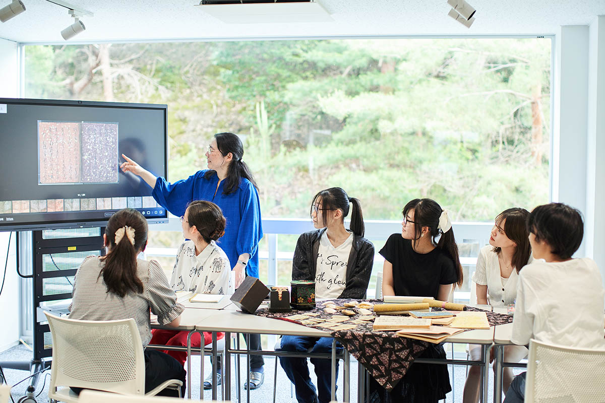 伝統美術・工芸の工房で2週間の実習を行う「京都の伝統産業実習」や、「マンガ史」「ゲームデザイン論」など、芸術系の学部もある精華大ならではの授業が盛りだくさん。他学部の学生と一緒に、企業や行政に対して企画の考案や商品制作に取り組むなど、人文学部でつちかった知識や言葉の力を発揮できる実践的な科目も多数あります。