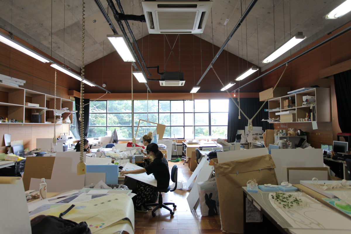 The workshop is filled with drawings and models for an atmosphere similar to that of an architectural office.
