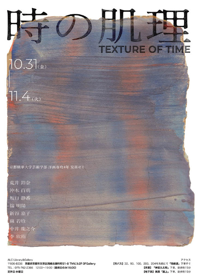 芸術学部洋画専攻 安喜万佐子ゼミに所属する4年生による作品展「時の肌理 TEXTURE OF TIME」が、京都・岡崎にあるALC Library&Galleryで開催されます。