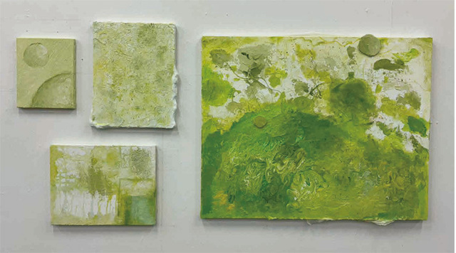 痕跡に興味を持ち試行する「痕」シリーズ、日々の些細なこと、手と土が戯れるよう描かれるフレスコ画など、様々な手法での表現を試みる。