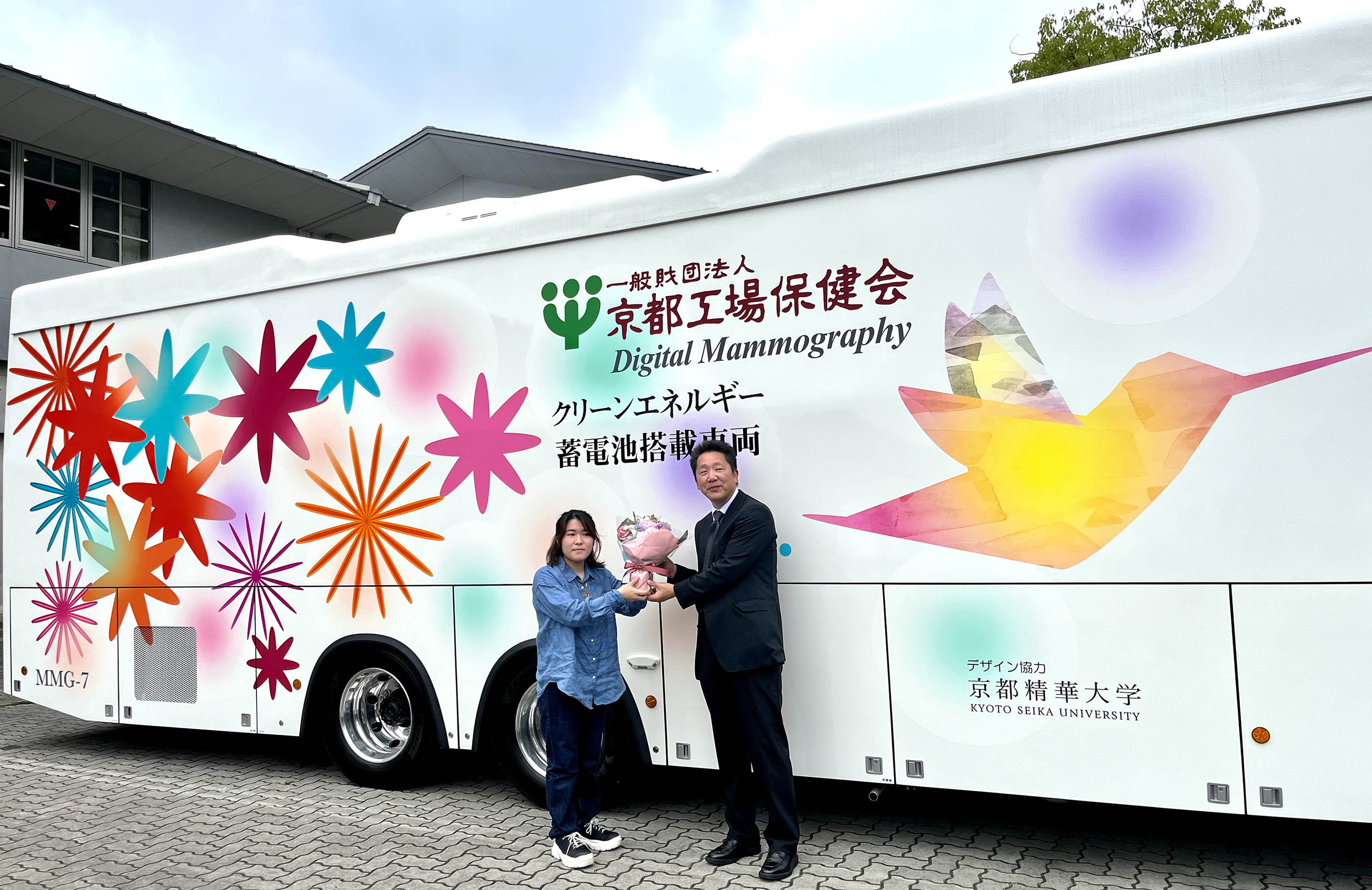 芸術学部版画専攻3年生の桑原里奈さんが外装デザインをした、一般財団法人 京都工場保健会の健康診断用X線検診車が完成し、6月16日に本学キャンパスにてお披露目会が開催されました。