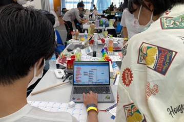 会場には、ソニーグループのIoTブロック「MESH™」、ロボット・プログラミング学習キット「KOOV®」、ロボットトイ「toio™(トイオ)」、マイコンボード「SPRESENSE™」など様々な機材が用意され、参加した学生たちはこれまで学んだ知識やスキルを活かして楽器制作に取り組みました。提供された機材などを使って、掃除道具を楽器にしてバンドを結成しました。最終発表で3分間の演奏をし、今回は審査員の「ゆる楽器ほぼオールスターズ」のメンバー、五十嵐LINDA渉さんから審査員賞をいただきました。