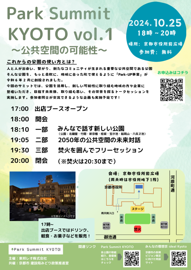 このサミットは、新たなコミュニティが生まれる重要な公共空間である公園を、もっと柔軟に、地域に合った形で使えるように京都市によって創設された「Park-UP事業」の取り組みのひとつとして開催されます。今回は、京都市の7つの公園の新しい可能性に取り組む地域の方、学生、企業、行政の担当者が登壇し、目指す未来像、取り組む思いやその背景を探るトークセッションなどが実施されます。