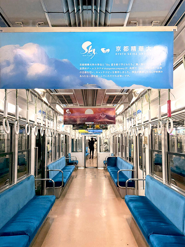 京都精華大学は、クリエイティブ業界の第一線で活躍する多彩なプロを迎えて行う授業「クリエイティブの現場」にて、世界的ゲームスタジオのthatgamecompany,Inc.(本社所在地:アメリカ合衆国カリフォルニア州)と連携し、ジャパン・ブランド・リードの水谷 立(みずたに りつ)氏による特別講義を開講いたしました。その集大成として、講義のワークショップ内で学生が考案したキャッチコピーを採用した、『Sky 星を紡ぐ子どもたち』のポスターを、2025年10月16日から11月3日の19日間、京都叡山電車車両「こもれび」にて展示しています。
