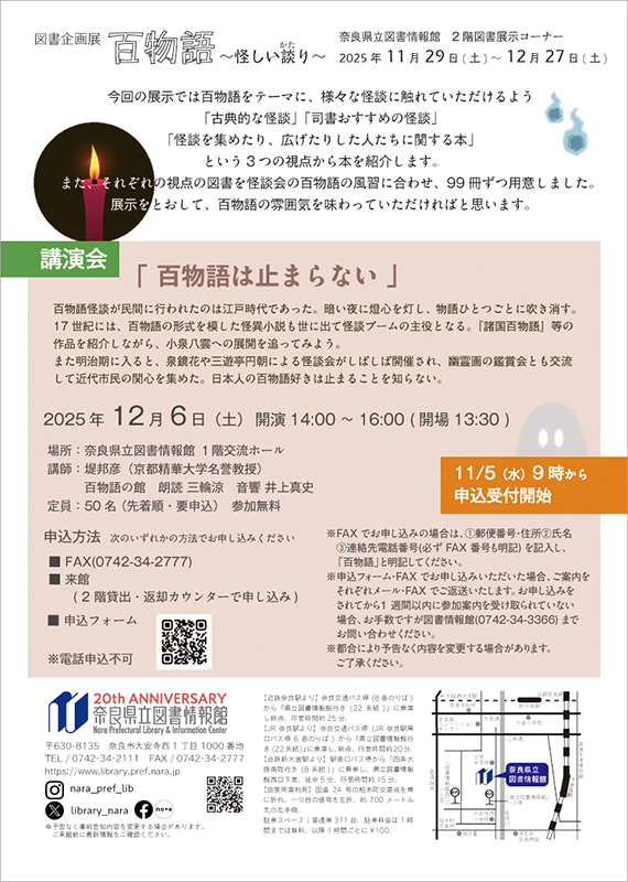 このイベントは、奈良県立図書情報館で11月29日より実施される図書企画展「百物語 ~怪しい談り~」の関連イベントとして行われる講演会です。
