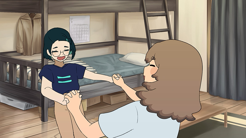 短編アニメーション作品『ターン・スキップ・ターン』は、雨樋畦蛙さんと五十嵐菜那さんが監督・演出を務め、アニメーションコースやキャラクターデザインコースの在学生らで構成されているターン・スキップ・ターン制作委員会が制作をした、本学入学後に取り組んだチームでの自主制作作品です。公式サイトでは、受賞コメントや審査員からの講評が公開されています。
