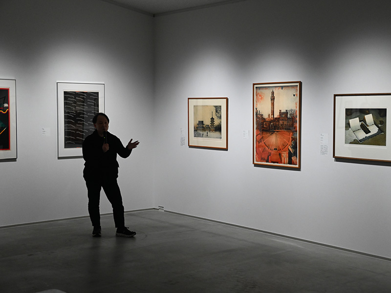 トークでは、資料収集委員として所蔵品の収集活動に関わった経験のある教員や所蔵作家をよく知る教員方にご出演いただき、洋画作品を生駒泰充(洋画専攻 教員)、拓本を山名伸生(人文学部 教員)、版画作品を北野裕之(版画専攻 教員)と池垣タダヒコ(版画専攻 教員)、小林陸一郎作品を吉野央子(立体造形専攻 教員)、西田潤作品を宮永甲太郎(陶芸専攻 教員)よりご紹介いただきました。