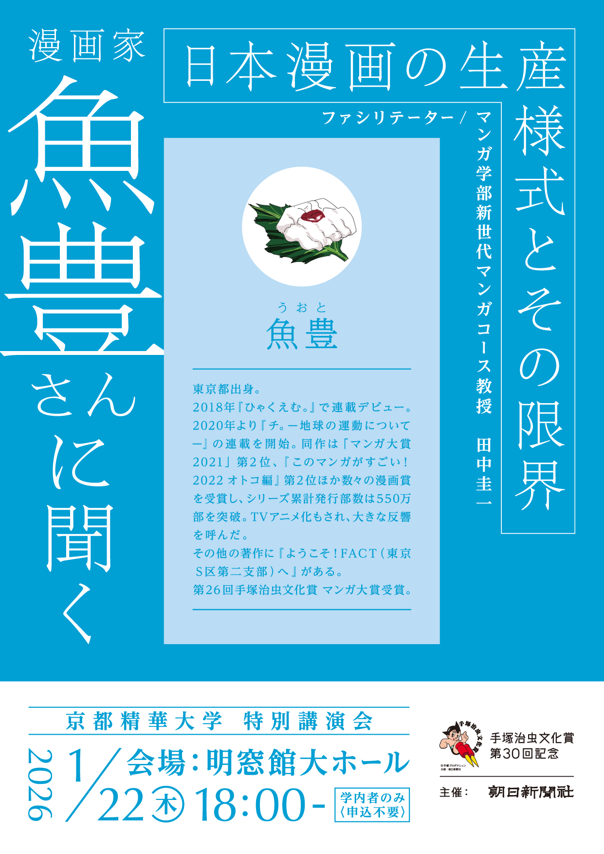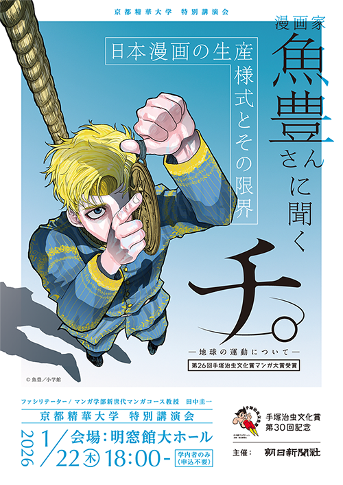 京都精華大学では、2026年1月22日(木)に京都精華大学明窓館大ホールにて、手塚治虫文化賞第30回を記念し、朝日新聞社主催による特別講演会を開催いたします。本講演には、大ヒット漫画『チ。-地球の運動について-』の作者である、漫画家・魚豊氏をお招きします。