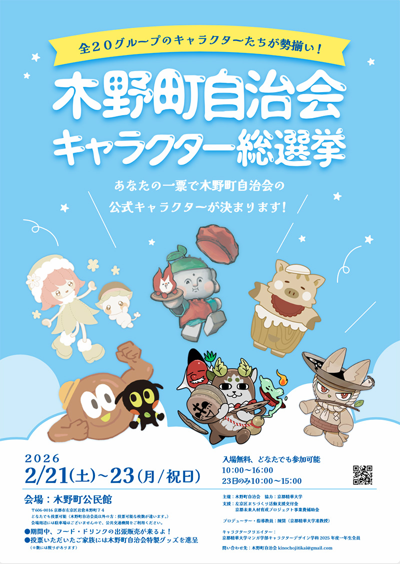 マンガ学部キャラクターデザインコース1年生が提案した、木野町自治会キャラクターの総選挙が行われます。