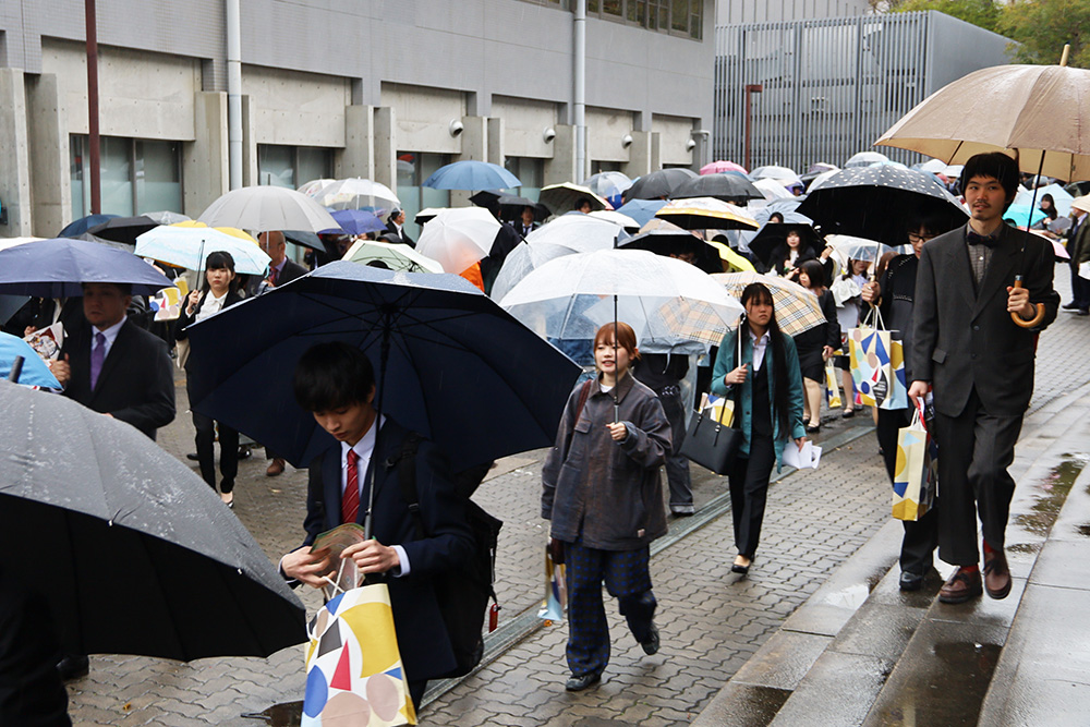 あいにくの雨天でしたが、式典後は会場外に在学生有志が集まり、クラブ・サークルの勧誘など、歓迎の催しが行われました。