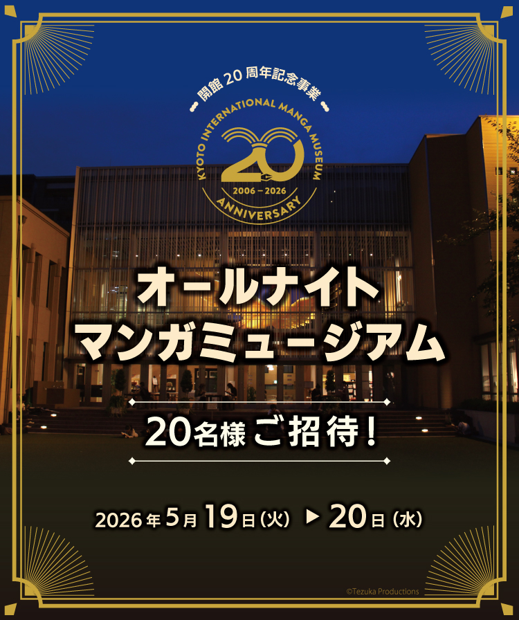 京都市および本学との共同事業として開設した京都国際マンガミュージアムは、2026年11月25日に開館20周年を迎えます。本イベントは、これまで多くの来場者からいただいたご要望「マンガミュージアムで一晩中過ごしたい」にお応えすべく、20周年記念イベントのひとつとして開催される、2006年開館以降初めてとなるオールナイトマンガイベントです。