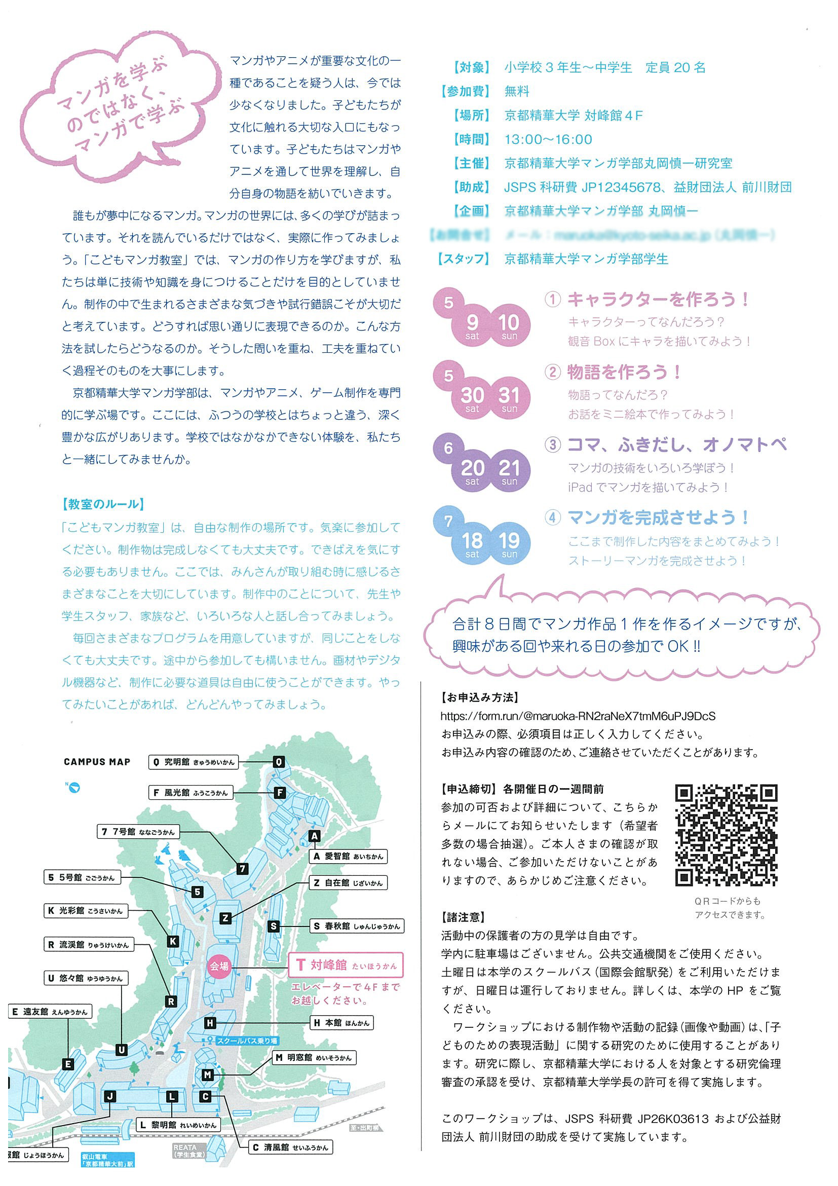 マンガ学部丸岡研究室(教員 丸岡慎一)が主催するワークショップ「こどもマンガ教室2026前期」が、本学キャンパス対峰館にて開催されます。