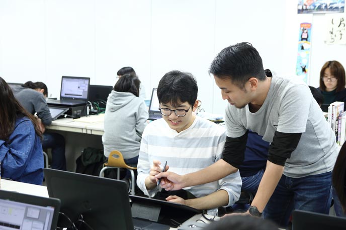 京都精華大学のアニメーションコースでは、こうした時代の流れを受け、「デジタル作画」の手法を学ぶためのカリキュラムを2017年よりスタート。いち早くデジタル作画を取り入れ、業界でも注目を集める新進気鋭のアニメーション制作会社「スタジオコロリド」のアニメーターを講師に招いています。