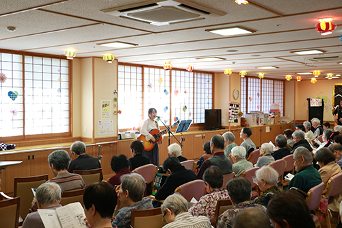 京都市内の介護施設「東山ケアセンター そよ風」の秋祭りにて、ポピュラーカルチャー学部音楽コース1年生 神川友奈さんがギターの弾き語り演奏を行いました。同施設とは、指導教員(音楽コース 永田純)の昨年のゼミ生が卒業制作の一環で、創立10周年秋祭にて歌う場をいただいてからのご縁となります。