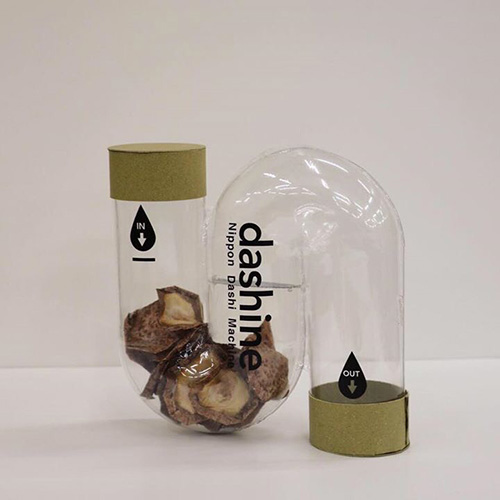入選作品「水を入れれば出汁がとれるDashine」は、S字パイプのような形状の出汁をとるための容器です。出汁をとる仕組みをビジュアル化することで、抽出している間もインテリアとして楽しめるようにデザインされています。