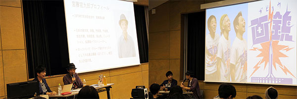 実は、進行役のおおひなたと宮藤さんは10年以上の親交があります。2003年に出版されたおおひなたの著書『遺伝子レベル剣』(イースト・プレス刊)の帯コメントが宮藤さんに依頼されたことがきっかけで交流が始まったそうです。以降、宮藤さんが所属するパンクコントバンド『グループ魂』のツアーTシャツやドラマシナリオ本の表紙イラストをおおひなたが手掛けるなど、長年の縁があり今回の特別講義が実現したそうです。